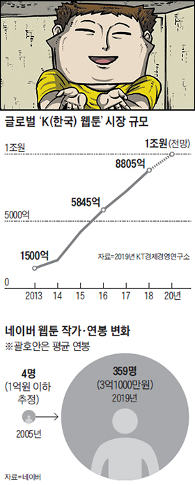 지난해 9월 기준 네이버 웹툰 전체 연재 작가(359명)의 연평균 수익은 3억 1000만 원이라고 합니다.