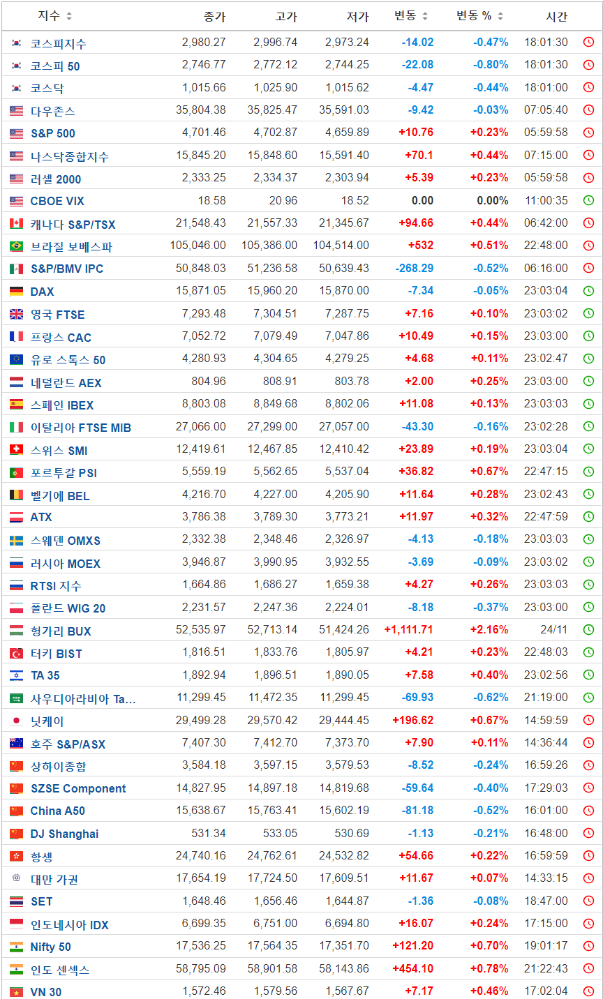 세계 증시를 보니 다행히 헝가리 유럽 등이 대체적으로 긍정적으로 상승을 하고 있는 중입니다.