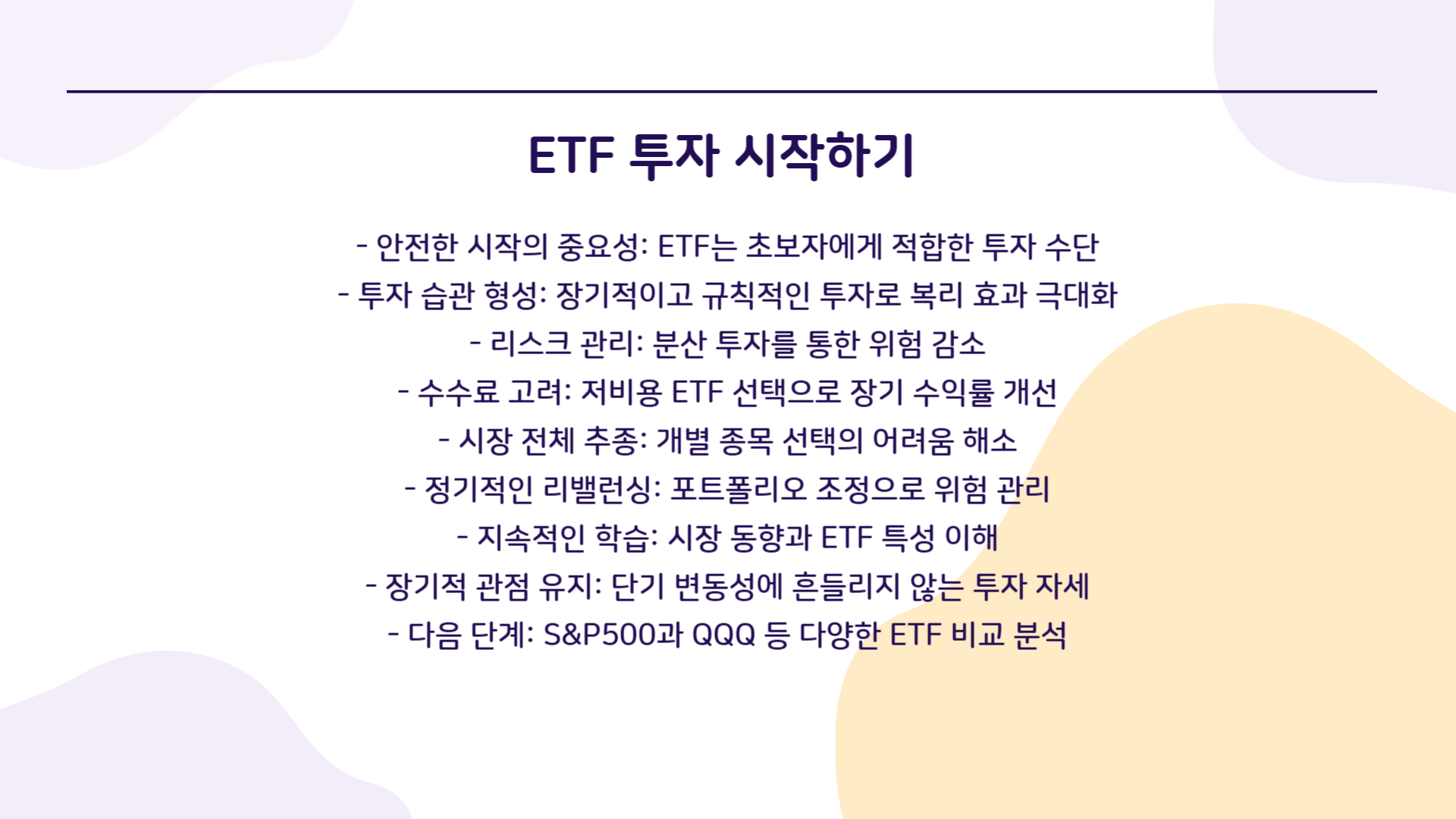 미국 주식을 처음 시작하려는 분들이라면 괜히 복잡한 개별 주식보다는, 훨씬 더 쉽고 안전하게 투자할 수 있는 **ETF(상장지수펀드)**부터 시작하는 것이 좋습니다. 이번 글에서는 ETF가 뭔지, 왜 초보자에게 적합한지, 그리고 어떤 ETF부터 시작하면 좋은지를 쉽고 확실하게 설명해드릴게요.