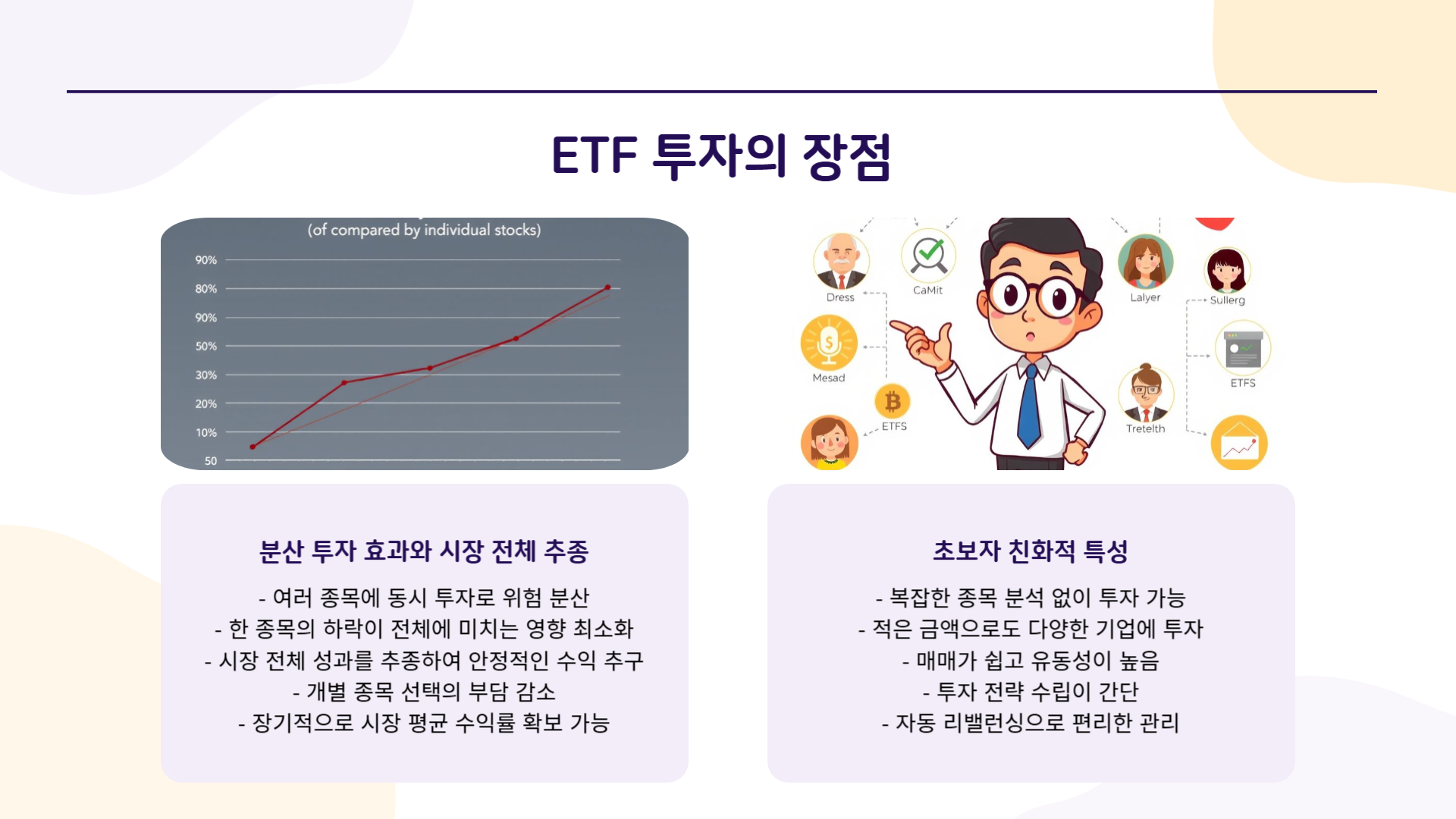 개별 주식은 고수익도 가능하지만, 잘못 고르면 손해가 큽니다. 반면 ETF는 여러 종목이 묶여 있어 분산 효과가 있어요. 즉, 한 종목이 떨어져도 전체는 괜찮을 수 있는 구조입니다.