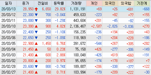 답변 : 개인 거래량은 역대 최대임에도 불구하고, 마감 금액은 23,300원, 4%밖에 상승하지 않았다.